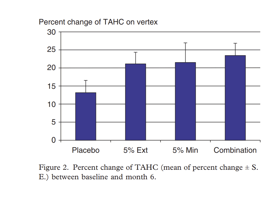 而薑黃萃取物與minoxidil 5%的混合溶劑效果比起純粹使用 minoxidil 5% 效果要來的更好。