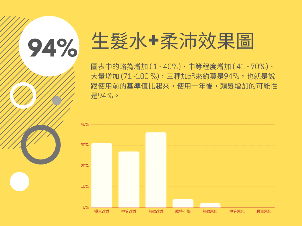 光使用口服藥柔沛約有80%的機率改善雄性禿,使用生髮水搭配口服藥約莫就是 94% 的機率可以讓頭髮在原本的基準線上更好。